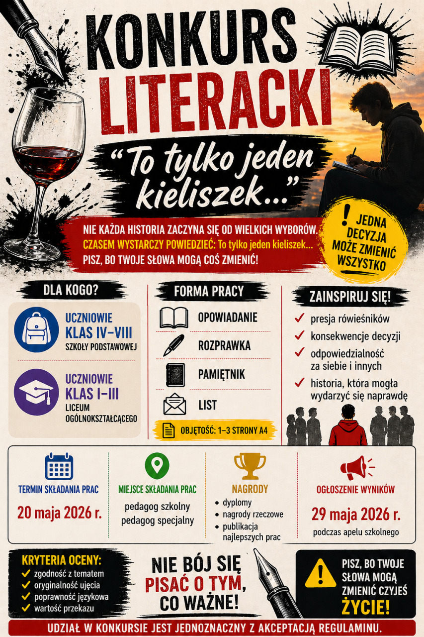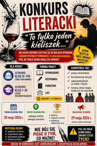 Z radością informujemy, że uczniowie naszej szkoły – Karolina, Kinga i Igor – odnieśli sukces w ogólnopolskich konkursach „DACHL-Märchen” oraz „DACHL-Lieder”. Karolina Szponar (kl. 7) zdobyła - 1 miejsce, Kinga Szmołda (kl. 2 LO) – 2 miejsce, a Igor Ścibak (kl. 8) zajął - 2 miejsce. Karolina i Kinga wykonały prace plastyczne inspirowane baśnią „Czerwony Kapturek” braci Grimm. Obie zachwyciły jury talentem, wyobraźnią i dojrzałością swoich rysunków. Wykonując utwór „Ich liebe Dich” Michaela Juniora, Igor pokonał setki uczestników z całej Polski, udowadniając swój niezwykły talent muzyczny oraz zdolności językowe. Gratulujemy uczniom i życzymy im dalszych sukcesów! Opiekunem merytorycznym uczniów była p. Monika Winiarczyk Galeria