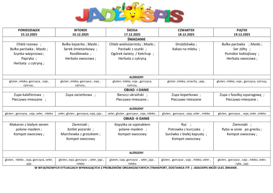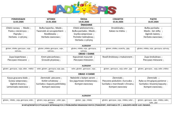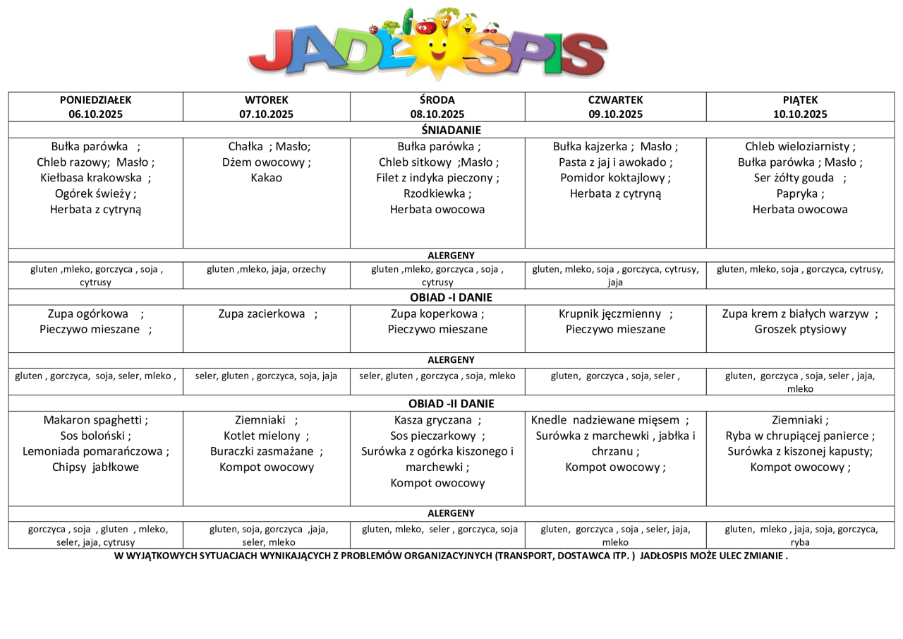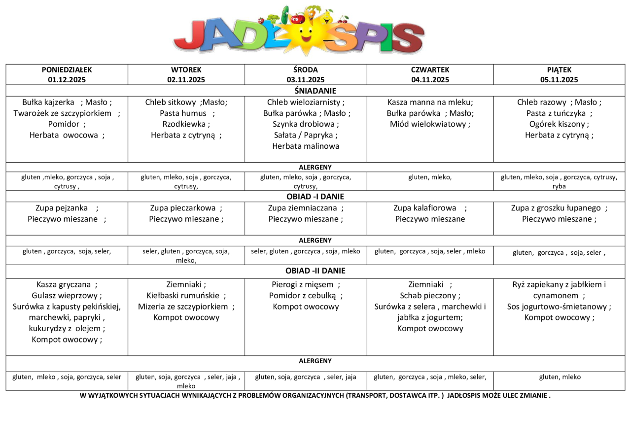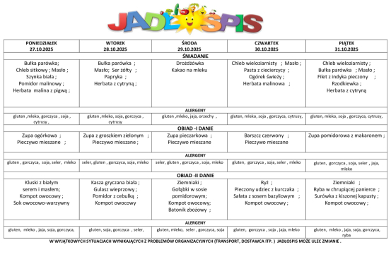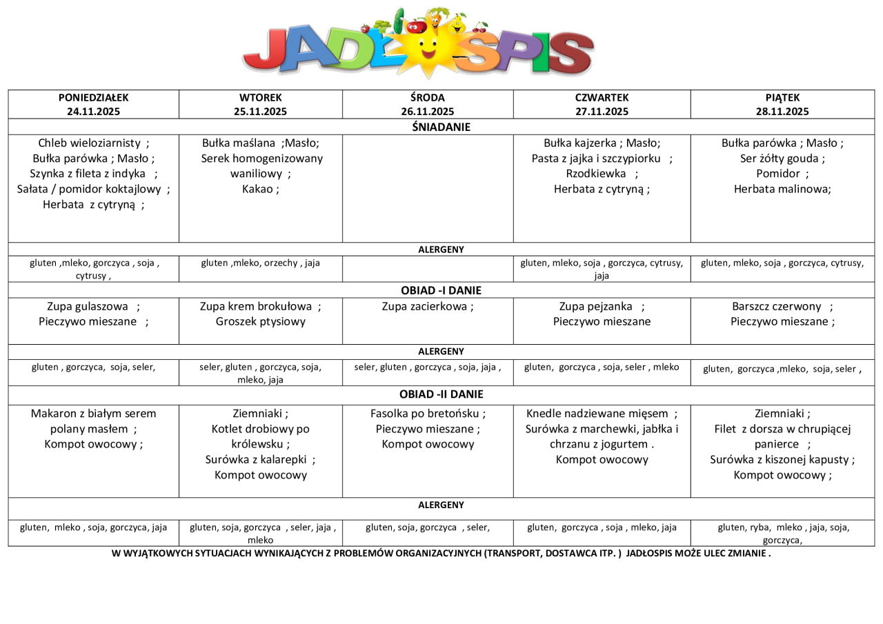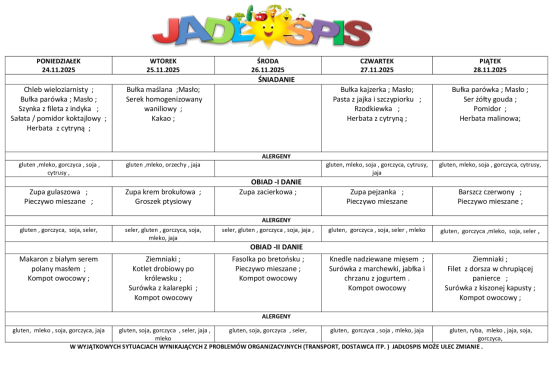 INFORMACJE O OBECNOŚCI POSZCZEGÓLNYCH ALERGENÓW PODAWANE BĘDĄ W CODZIENNYM JADŁOSPISIE
